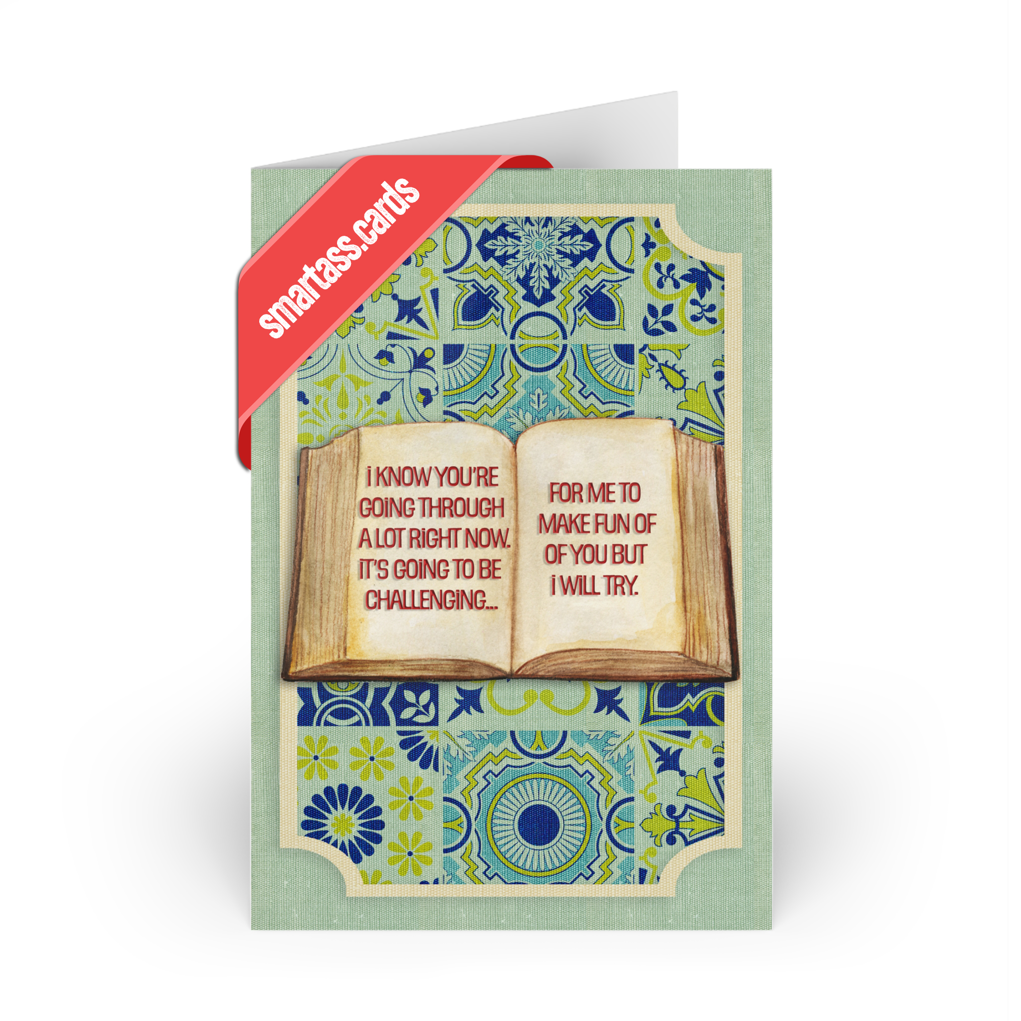Categories: Select a Category Support & Sympathy Get Well Birthday Thank You Congratulations Anniversary Holiday Support & Sympathy Quick View Funny Dog Sympathy Card – “Sorry for Your Loss but Guess What Part of Your Body Won’t Miss Your Pet” – Blank Inside, SmartAss Support Card $5.99 Add To Cart Added! Quick View Funny Cat Sympathy Card – “Sorry for Your Loss but Guess What Part of Your Body Won’t Miss Your Pet” – Blank Inside, SmartAss Support Card $5.99 Add To Cart Added! Quick View Funny Support Card –“Today Might Suck But Tomorrow? Tomorrow Might Suck Too”– Blank Inside, SmartAss Greeting Card $5.99 Add to Cart Added! Quick View Funny Support Card – “Life Hits Like a Bike with No Seat” – Blank Inside, SmartAss Greeting Card $5.99 Add to Cart Added! Quick View Funny Support Card – “Bad Days Shouldn't Be Spent Alone. They Should Be Spent With Another Unhealthy Eater”– Blank Inside, SmartAss Greeting Card $5.99 Add to Cart Added! Quick View Funny Support Card –“Hey, Twinkle Tits, I'm Thinking Of You. But That's It! Anything More and I have To Charge” – Blank Inside, SmartAss Greeting Card $5.99 Add to Cart Added! Quick View Funny Support Card –“You Shouldn't Be Alone Today. Let's Get Lunch! (your turn to buy)”– Blank Inside, SmartAss Greeting Card $5.99 Add to Cart Added! Quick View Funny Support Card –“You Can't Run From All of Your Problems. But You Can Run From Most of Them”– Blank Inside, SmartAss Greeting Card $5.99 Add to Cart Added! Quick View Funny Support Card –“This Does Not Define You. But That Haircut You Had in High School Does”– Blank Inside, SmartAss Greeting Card $5.99 Add to Cart Added! Quick View Funny Support Card –“Don't Give Up. Just Dream Way Smaller”– Blank Inside, SmartAss Greeting Card $5.99 Add to Cart Added! Quick View Funny Support Card –“It's Hard Because Dad is No Longer Here. Even Harder for You Because I was His Favorite”– Blank Inside, SmartAss Greeting Card $5.99 Add to Cart Added! Quick View Funny Support Card –“It's Hard Because Mom is No Longer Here. Even Harder For You Because I Was Her Favorite”– Blank Inside, SmartAss Greeting Card $5.99 Add to Cart Added! Quick View Funny Support Card –“I Know You're Going Through A Lot Right Now. It's Going To Be Challenging...For Me To Make Fun of You But I Will Try”– Blank Inside, SmartAss Greeting Card $5.99 Add to Cart Added! Quick View Funny Support Card –“You're Bigger Than This But I Am Still Better Than You”– Blank Inside, SmartAss Greeting Card $5.99 Add to Cart Added! Quick View Funny Support Card –“As One Ugly Crier To Another- Tone It Down a Little”– Blank Inside, SmartAss Greeting Card $5.99 Add to Cart Added! Quick View Funny Support Card –“It's OK To Bail On Shit. I'm Using You As An Excuse To Get Out of Something Next Week”– Blank Inside, SmartAss Greeting Card $5.99 Add to Cart Added! Quick View Funny Support Card –“And The Lord Replied, "I Love You and Would Never Leave You During Diffic- Hol' Up. I Gotta Take This"– Blank Inside, SmartAss Greeting Card $5.99 Add to Cart Added! Quick View Funny Support/Pet Sympathy Card –“Life is Short but Love is Forever...p.s I Hid a Turd Somewhere in the House LOL”– Blank Inside, SmartAss Greeting Card $5.99 Add to Cart Added! Quick View Funny Support Card –“Letting Go Can Be Hard. But Reminding People That They Owe You Money Can Be Hard Too” – Blank Inside, SmartAss Greeting Card $5.99 Add to Cart Added! Quick View Funny Support Card –“Always check in on your furry little critter friends. Make sure they are eating, drinking, & washing their ass…check in on your pets too” – Blank Inside, SmartAss Greeting Card $5.99 Add to Cart Added!